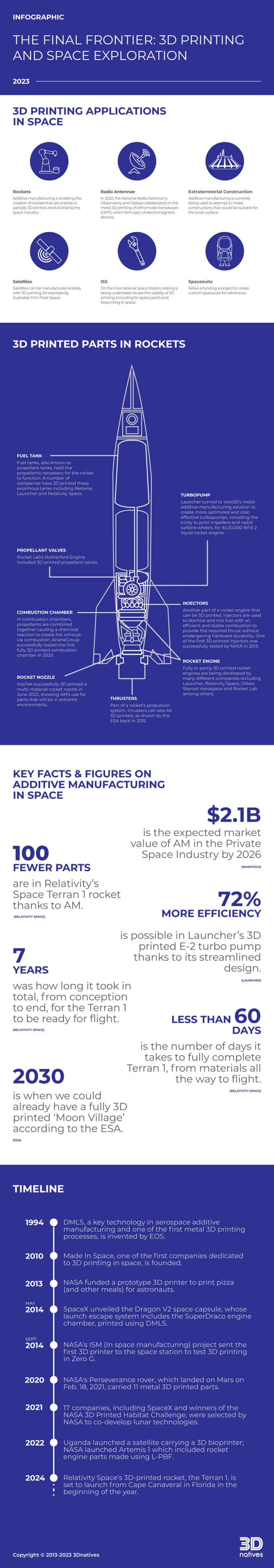 In order to give you an overview of how 3D printing has already been used for applications in space, as well as to understand what innovations may await us in the future, we at 3Dnatives have taken it upon ourselves to create an infographic on 3D printing in space exploration, which you can find below (click on the image to zoom in).